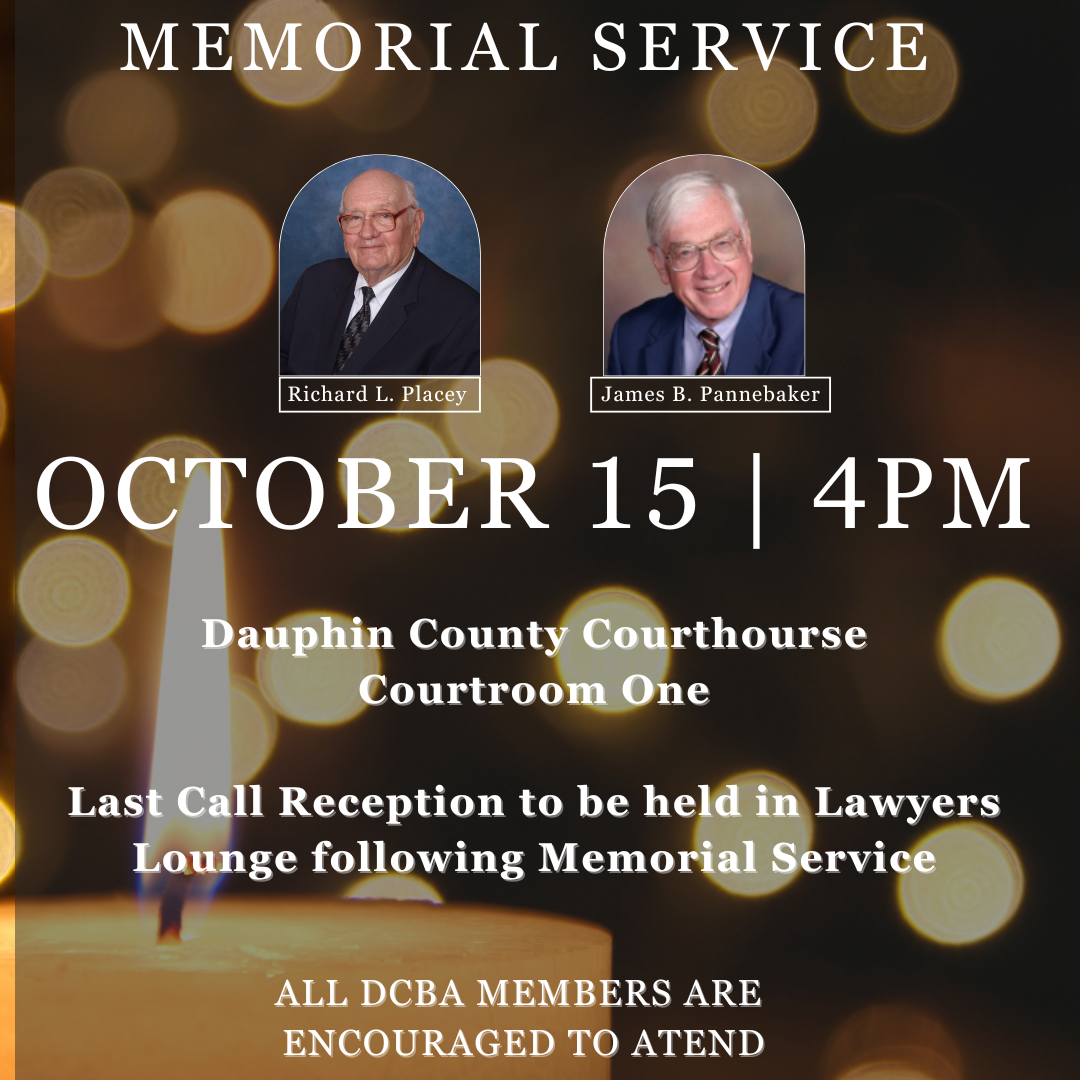 Listed among the purposes of the Dauphin County Bar Association in Article II, Section 1 of our By-Laws is ". . . to perpetuate the history of the profession and the memory of its members . . ." In that vein, Memorial Services are periodically scheduled to honor DCBA members who have recently passed away. This gives our members the opportunity to demonstrate respect for their former colleagues and commitment to one of the finest traditions of our Bar Association. Listed by year are links to each Memorial Resolution since 2008 when the DCBA began listing these tributes on line.