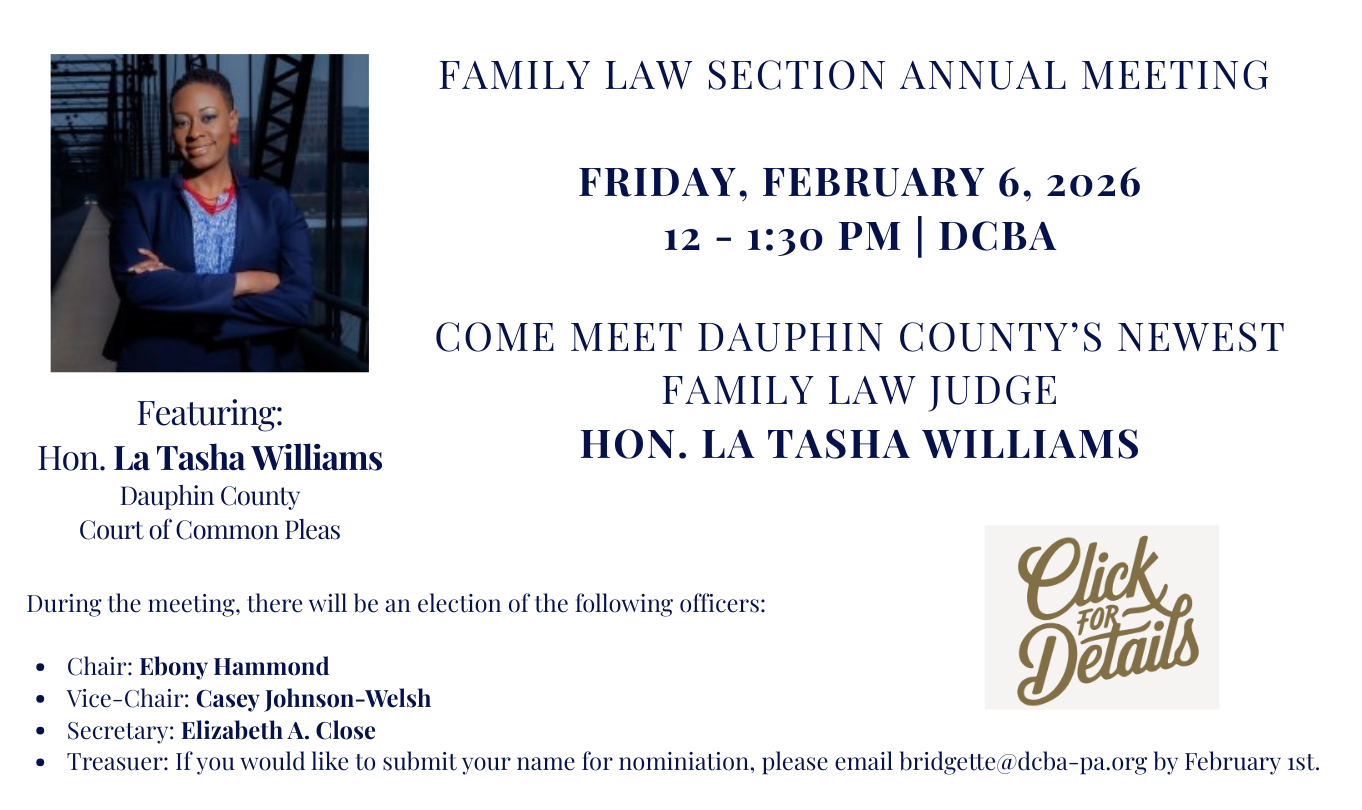 On February 6, 2026, the Family Law Section will have their Election Meeting for 2026 officers. The meeting will start at 12:00 and will end at 1:30 p.m. This meeting is in lieu of the traditional Holiday Party. The Family Law Section will elect their new Treasurer and provide a lunch for all members that confirm their attendance by January 30, 2026. We are looking for individuals that are interested in serving as Treasurer and if you are interested in serving you should submit your name by January 30, 2026, for the election on February 6, 2026. This will be a time for all members to get together to discuss the section's agenda for the upcoming year and meet our new family law judge, La Tasha C. Williams. She has a busy schedule on the 6th but will be at meeting from 12:00 -12:30 p.m. to meet members and share a meal. This will be a very informal meeting and the goal is to meet other members of the section and share our vision for 2026.