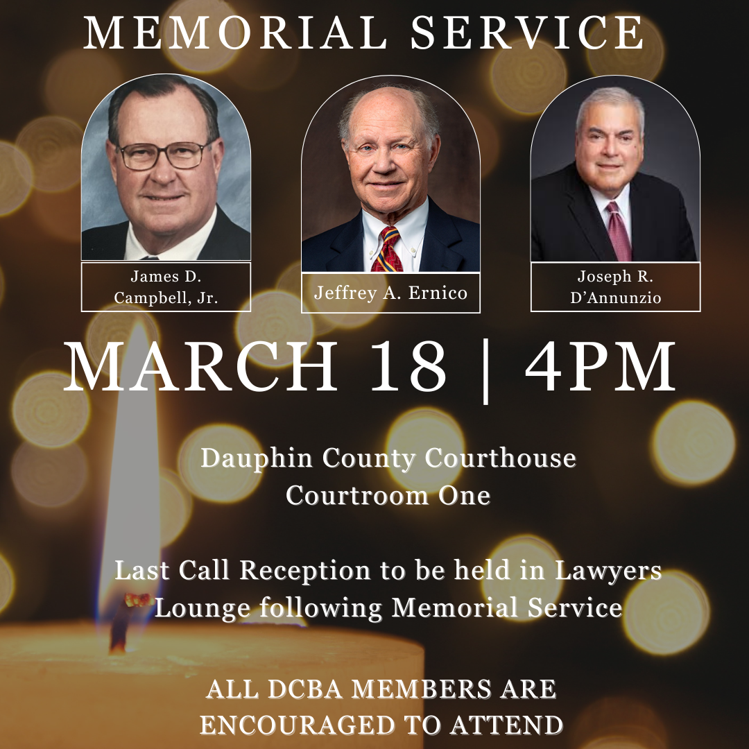 Listed among the purposes of the Dauphin County Bar Association in Article II, Section 1 of our By-Laws is ". . . to perpetuate the history of the profession and the memory of its members . . ." In that vein, Memorial Services are periodically scheduled to honor DCBA members who have recently passed away. This gives our members the opportunity to demonstrate respect for their former colleagues and commitment to one of the finest traditions of our Bar Association. Listed by year are links to each Memorial Resolution since 2008 when the DCBA began listing these tributes on line.